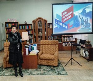 На фоне презентации сотрудники библиотеки, главный библиотекарь Рекеда Ирина Валентиновна и заведующая читальными залами Остапенко Людмила Николаевна, представили исторические факты о возникновении Дня народного единства, о том, как народное ополчение добилось освобождения Москвы от иноземцев, а также рассказали о народных героях Кузьме Минине и Дмитрии Пожарском, о примерах единения народов России в годы суровых испытаний.