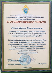 Сотрудник Научной библиотеки им. А. Н. Коняева Луганского государственного университета имени Владимира Даля, главный библиотекарь Ирина Валентиновна Рекеда награждена Благодарственным письмом от Луганской академии Следственного комитета России за высокий профессионализм, преданность делу, участие в мероприятиях патриотической направленности, способствующих сохранению исторической памяти и формированию гражданской позиции молодежи, проводимых в Луганской академии Следственного комитета.