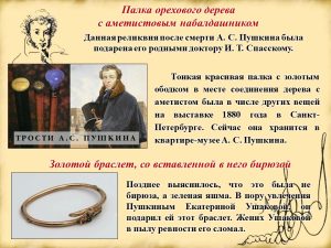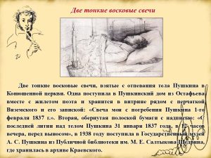 Сегодня, вспоминая великого поэта, мы хотим рассказать вам о некоторых его реликвиях и талисманах. Особую группу пушкинских реликвий составляют предметы, связанные со смертью и похоронами поэта.