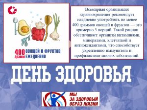 В России к Всемирному дню здоровья приурочена масштабная акция «Время быть здоровым!». Она пропагандирует здоровый образ жизни. Также с 5 по 13 апреля 2026 года проходит Всероссийская акция «Будь здоров!», направленная на профилактику заболеваний и популяризацию здорового образа жизни.