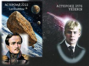 - ЕСЕНИН («2576 Yesenin») – это небесное тело было открыто советским астрономом Людмилой Журавлёвой в 1974 году в Крымской астрофизической обсерватории, а своё официальное название в честь поэта оно получило 28 января 1983 года.