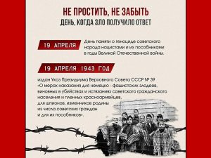 Дата выбрана не случайно, именно 19 апреля 1943 года был издан указ президиума Верховного Совета СССР № 39 «О мерах наказания для немецко-фашистских злодеев, виновных в убийствах и истязаниях советского гражданского населения и пленных красноармейцев, для шпионов, изменников родины из числа советских граждан и для их пособников». Этот документ стал правовым основанием расследований преступлений нацистов против советского народа и заложил основы привлечения к ответственности за военные преступления, преступления против мира и безопасности человечества.